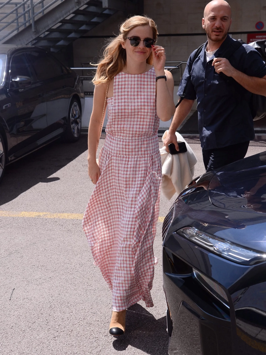 Звезда "Гарри Поттера" Эмма Уотсон впервые за 12 лет появилась на Каннском кинофестивале. 35-летнюю актрису заметили папарацци около Дворца фестивалей. Эмма появилась перед фотографами в летнем платье макси в клетку без рукавов и замшевых сапогах на каблуке. Образ дополнили сумка на цепочке и солнцезащитные очки Ray-Ban.