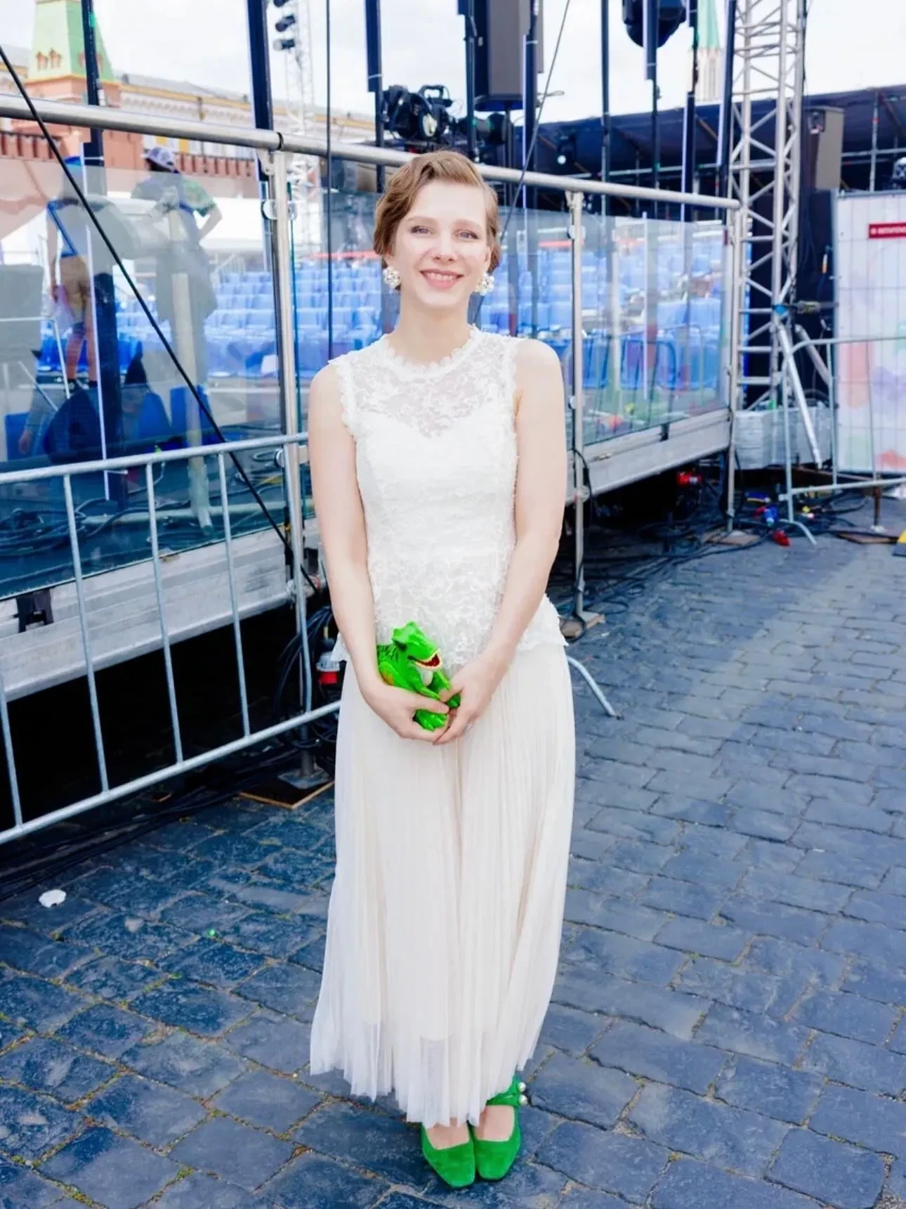 На фото 30-летняя актриса позирует в длинном белом платье с кружевным верхом и плиссированной юбкой. Образ дополняют зелёные туфли и игрушка-динозавр, которую, как рассказала сама Елизавета, вручил ей в качестве талисмана её трёхлетний сын Лев, рожденный от супруга Ильи Авербуха. "Он очень долго выбирал игрушку, которую хотел дать мне с собой в дорогу. Выбрал зелёного динозавра и наказал с ним не расставаться. Так мы с динозавриком в руках и с Лёвой в сердце и провели весь день", — объяснила она в подписи.