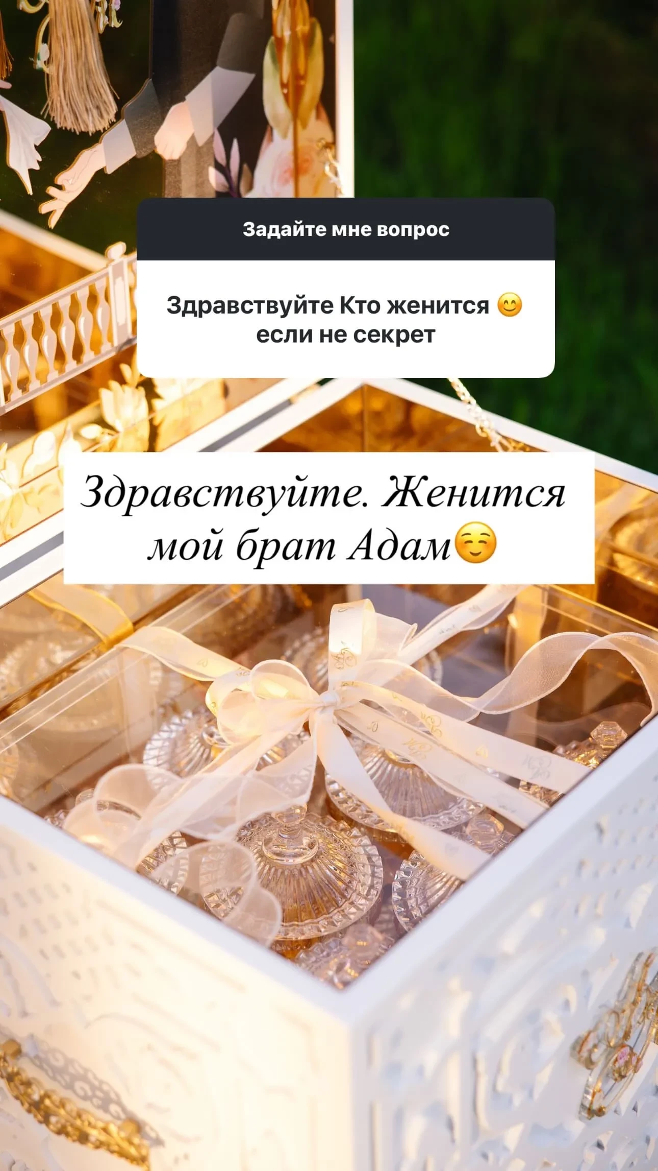Айшат опубликовала несколько снимков и ответила на вопросы подписчиков. Она рассказала, что свадьба пройдёт в родном селе Кадыровых – Ахмат-Юрте. Также она отметила, что в день свадьбы ей "не до телефона", поэтому она не сможет показать фотографии. Айшат рассказала, что невесту зовут Медни и она из того же села. Она также рассказала, что видео никаких не будет, так как "таково желание родителей", однако свой образ она обещала показать. Больше подробностей Айшат не раскрыла, а только добавила, что её брат счастлив.