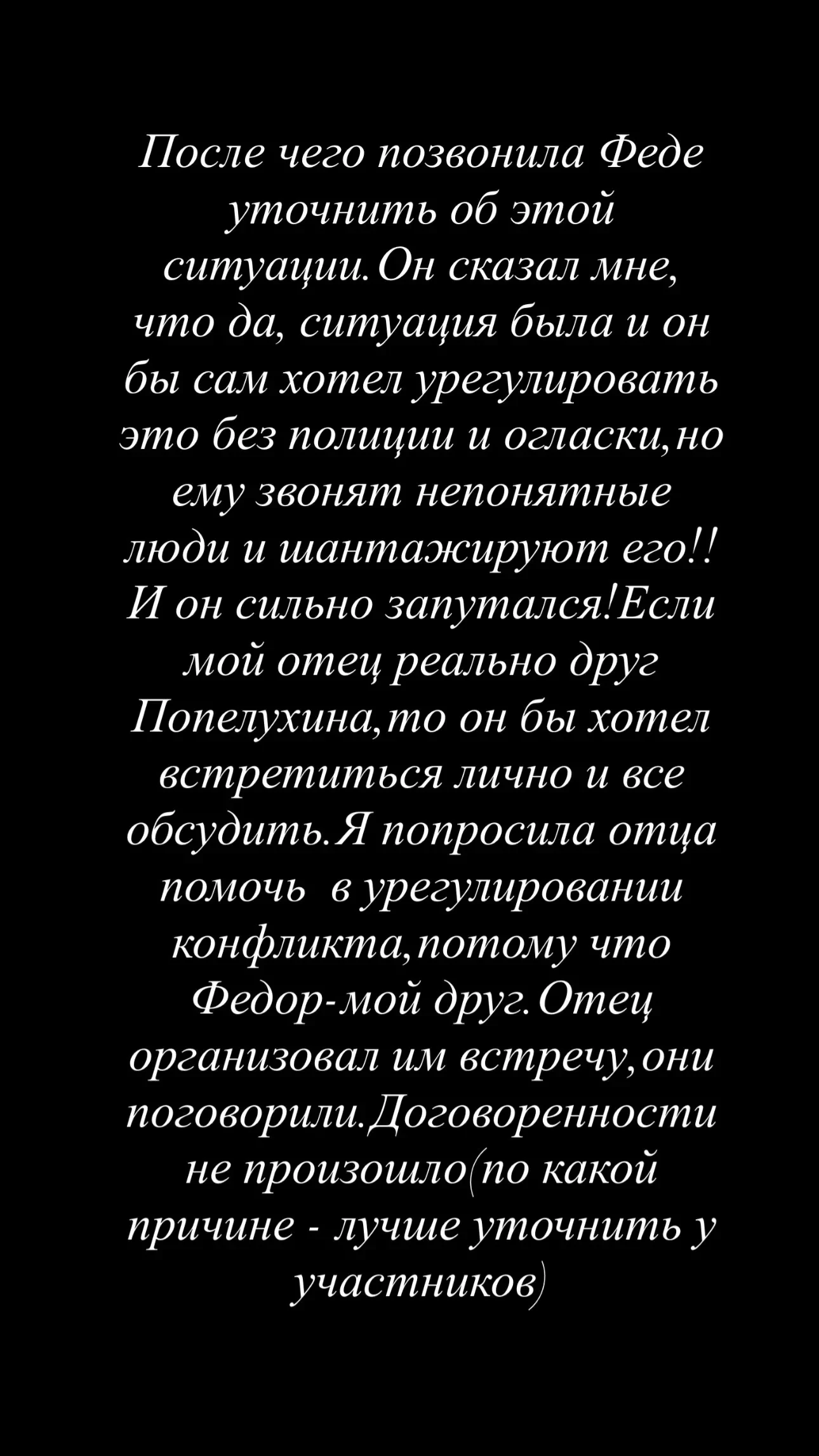 Так, Дарья рассказала, что один из пострадавших, бизнесмен Андрей Попелуха, является другом её отца. После инцидента Попелуха, желая уладить ситуацию без привлечения правоохранительных органов, якобы связался с Русланом Валитовым и поинтересовался, знает ли тот Смолова. Отец Дарьи, в свою очередь, обратился к ней, чтобы уточнить, в каких отношениях она находится с футболистом. "Я позвонила Феде, чтобы уточнить об этой ситуации. Он сказал мне, что ситуация была, он бы сам хотел урегулировать это без полиции и огласки, но ему звонят непонятные люди и шантажируют его. И он сильно запутался", — отметила Валитова.