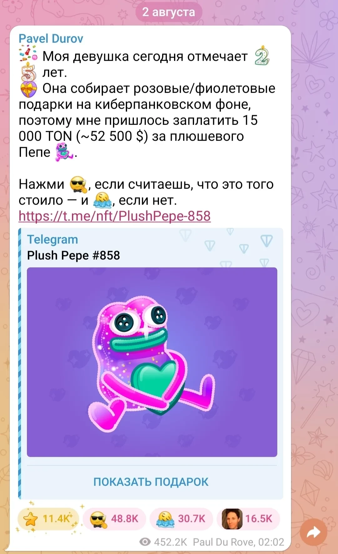 В своём блоге основатель Telegram рассказал, что уже сделал возлюбленной подарок: купил ей NFT-токен стоимостью около 52 тысяч долларов. “Моя девушка сегодня отмечает 25-летие. Она собирает розовые/фиолетовые подарки на киберпанковском фоне, поэтому мне пришлось заплатить 15 000 TON (~52 500 $) за плюшевого Пепе”, — написал миллиардер и предложил подписчикам проголосовать, стоило оно того или нет. Большинство ответило, что стоило.