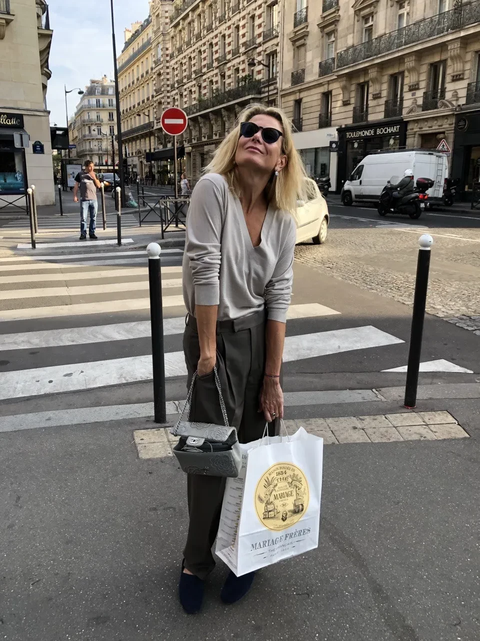 "Я всегда хочу в Париж. Долгие прогулки по набережным, сhausson aux pommes (булочка с яблоком) из кафе Carette — по форме вобла-воблой, а на вкус лучше не бывает, ледяное шампанское, зеленые стулья Люксембургского сада и, конечно, любимый рядом. В общем, romantique в идеальном о нем представлении", — подписала 51-летняя актриса фотографии, на которых позирует на летней веранде любимого кафе и на местной улочке. Она также добавила снимок с мужем и теми самыми булочками.
