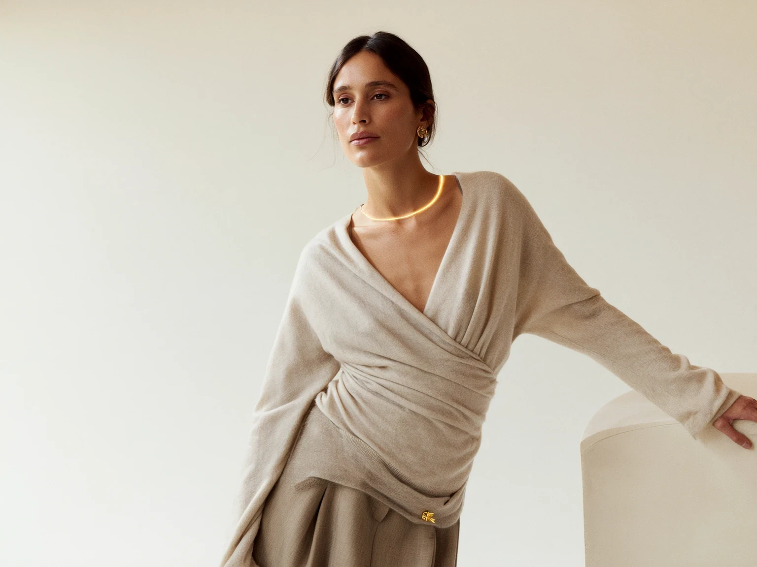 визуально простые вещи из благородных материалов: кашемир, шерсть, шелк, кожа. Без явного декора, но с безупречной посадкой и ощущением качества.