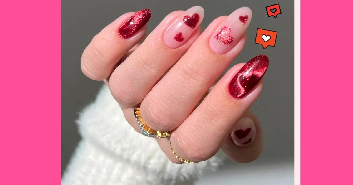 Сердца — самый очевидный символ 14 февраля, но их легко обыграть так, чтобы маникюр не выглядел наивно. Секрет — в размере, количестве и цветовой подаче.
