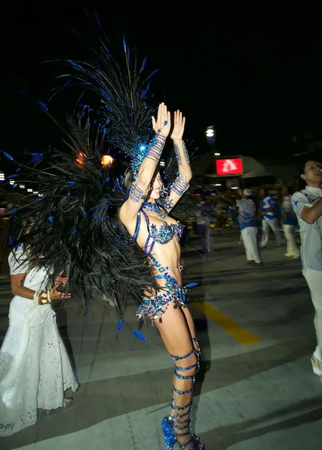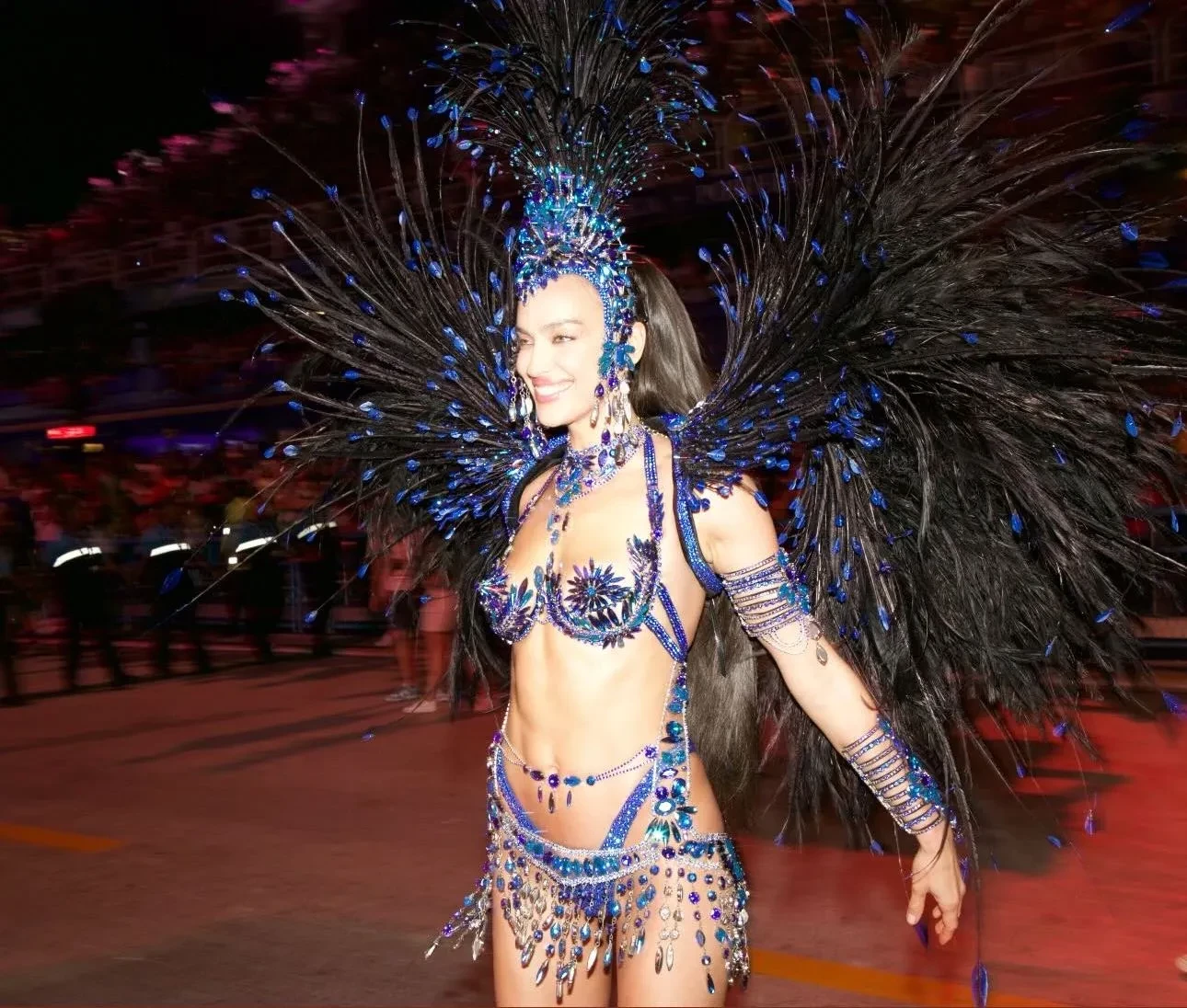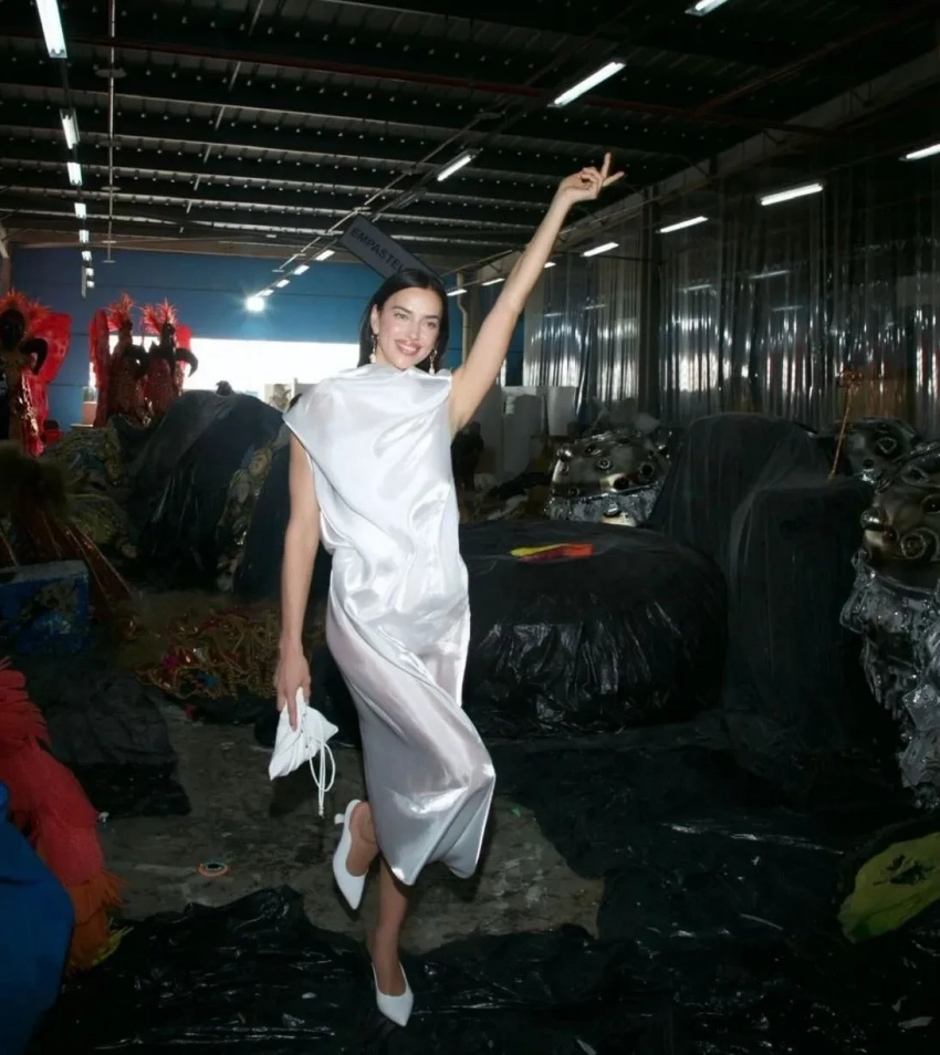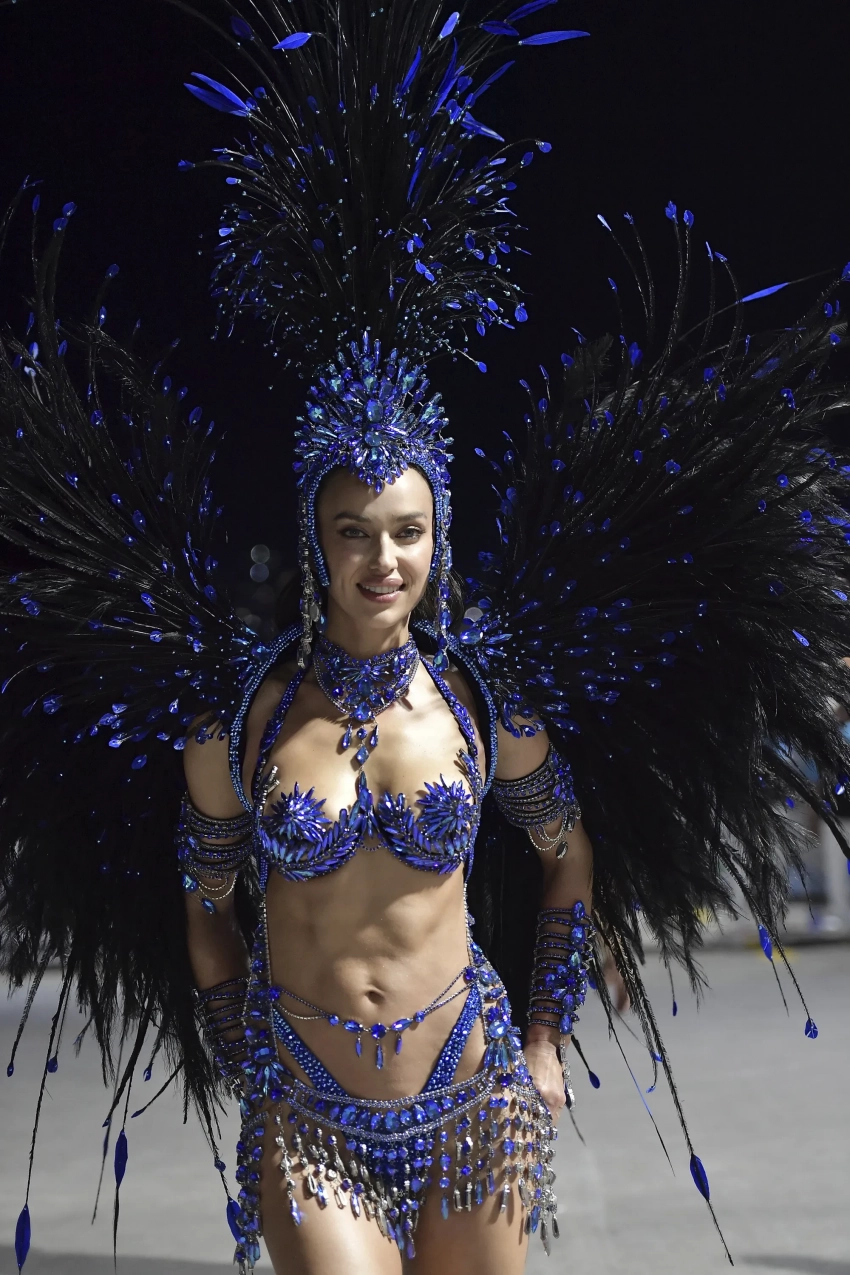 Перед карнавалом Ирина Шейк подогрела внимание подписчиков к мероприятию, опубликовав фото в обнажённом виде и в украшениях синего цвета. Прошлой ночью Ирина прошлась по улицам бразильского города в блестящем бикини этого же цвета и головном уборе с перьями.
