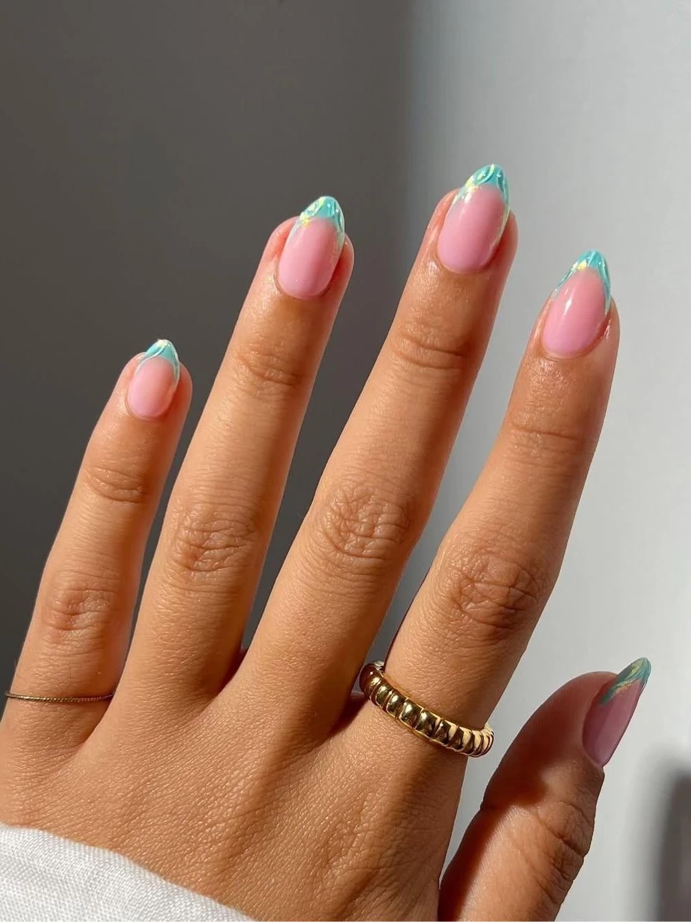 Сочетание мягких пастельных оттенков и сияющих кругов по центру ногтя (эффект ауры) создаёт на ногтях настоящий калейдоскоп изобилия. Лиловый, небесно-голубой, розовый и салатовый — всё это символы лёгкости, удачи и весенней свежести.