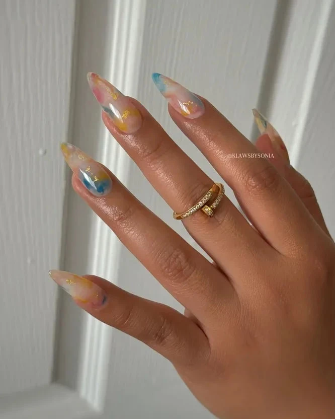 Акварельная техника, напоминающая мазки кисти по холсту, идеально подходит для летнего маникюра. Полупрозрачная молочная база, пастельные разводы и едва заметные вкрапления золотой потали создают ощущение художественной легкости. Это идеальный выбор для тех, кто хочет добавить немного блеска, не нарушая нежного образа.