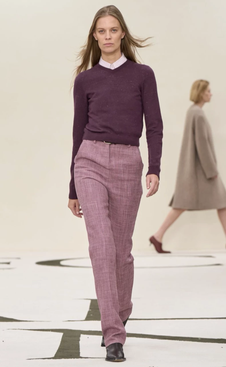 У бренда Bibhu Mohapatra йогуртово-розовый встречается в длинном кашемировом пальто. Но особенно эффектно он смотрится в дуэте с баклажановым — насыщенным фиолетовым оттенком. Это сочетание делает образ дорогим и утонченным, подчеркивая индивидуальность. А дополняющие его аксессуары — например, цветные перчатки — подчеркивают тренд на яркие детали, который сохранится с весны 2025 и в осеннем сезоне.