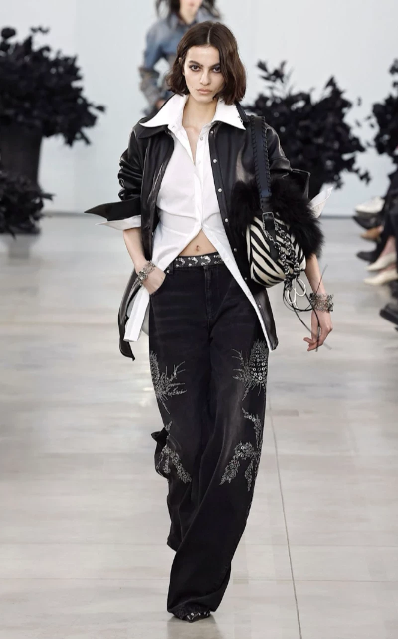 Блестящие украшения, вышивки, пайетки и декоративные камни — все это вновь возвращается в мир денима. На показах Michael Kors осенью и зимой 2025 демонстрировались яркие акценты даже в верхней одежде. Такие джинсы становятся центром образа, поэтому остальные элементы стоит держать в монохроме.
