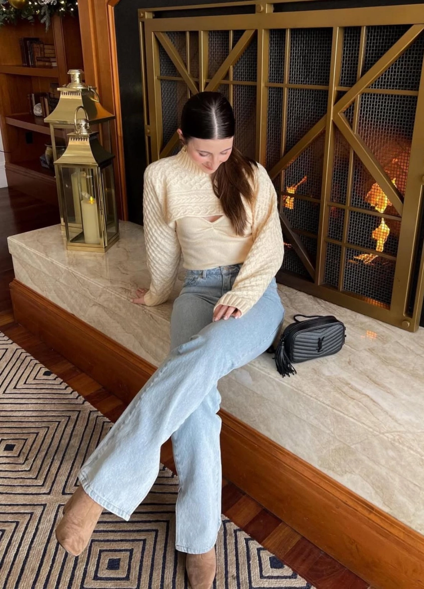 Повседневный образ для прогулок и встреч с друзьями: прямые джинсы, базовый топ и мягкое вязаное болеро пастельного оттенка.